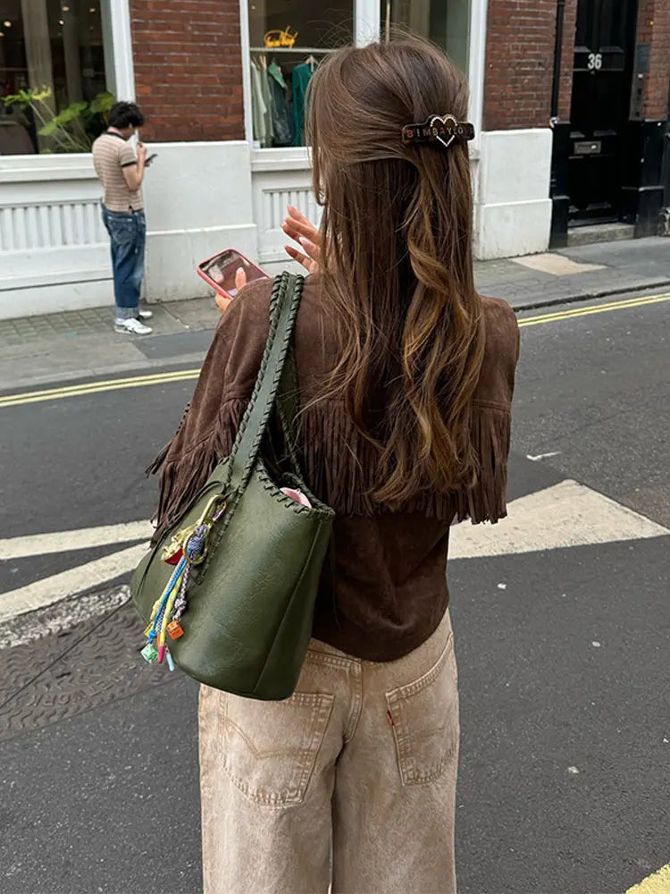 Fashion Tassels Patchwork Long Sleeve Suede Jacket Women Lapel Single Breasted Slim Short Coats 2024 Autumn Lady High Street Top