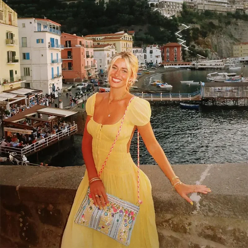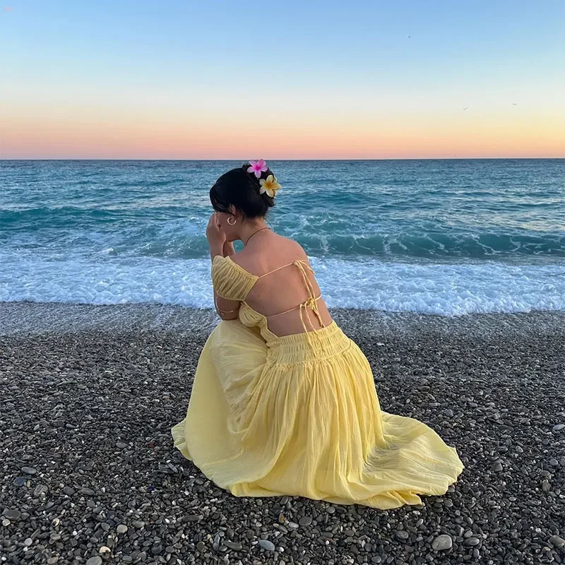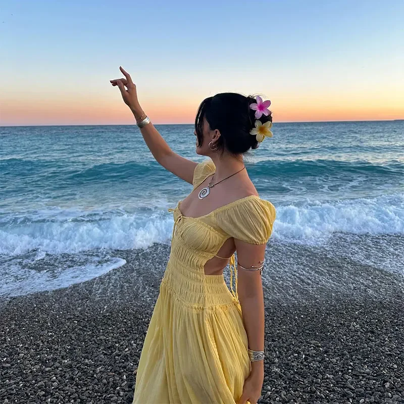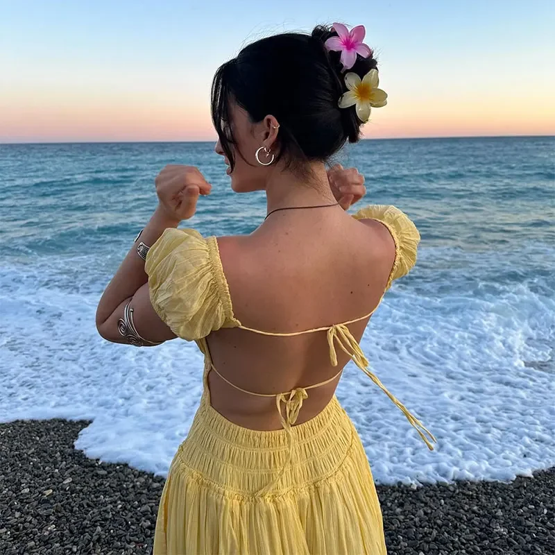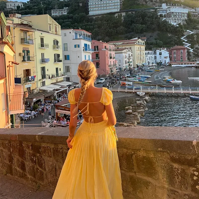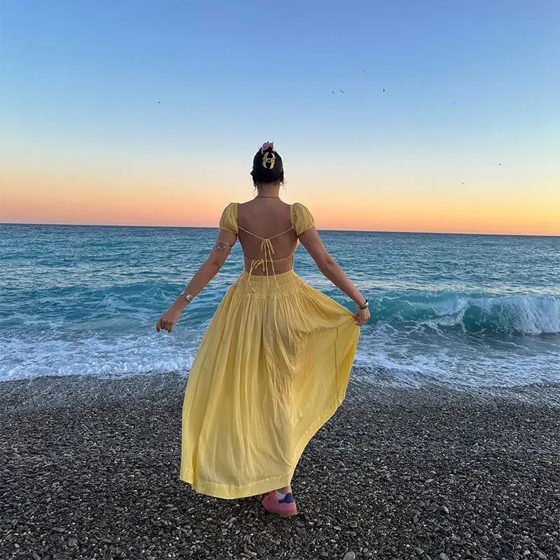 Summer Vacation Elegant Backless Square Neck Long Dress Sexy Lace Up High Waist Slim Dresses Lady Holiday Beachwear
