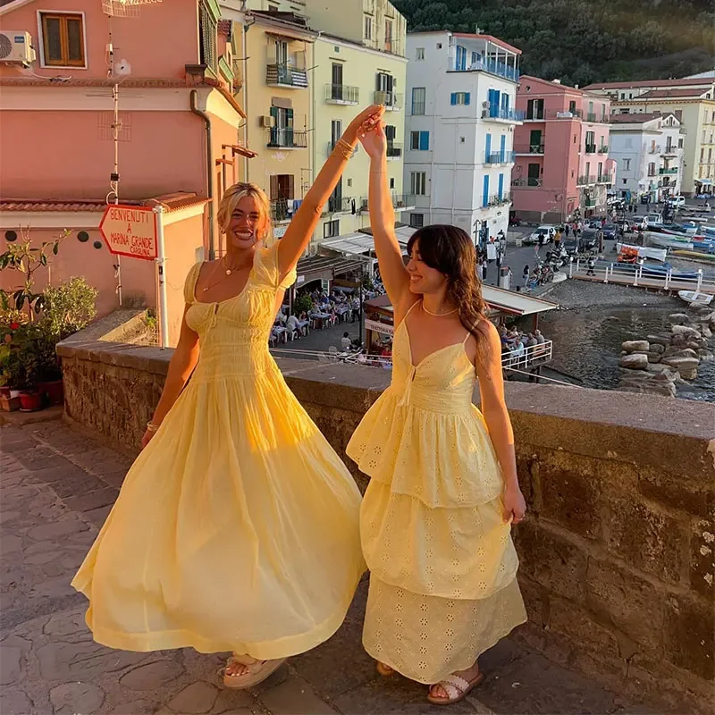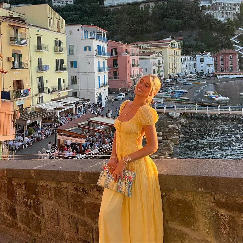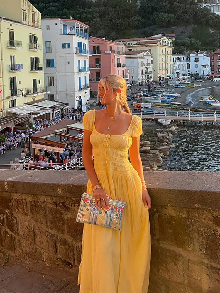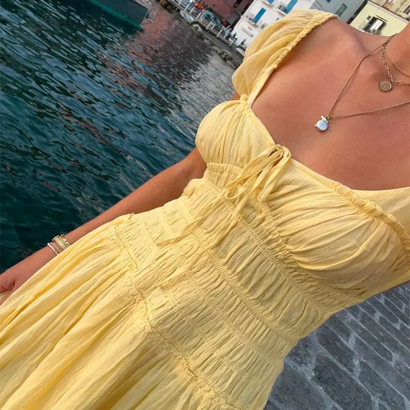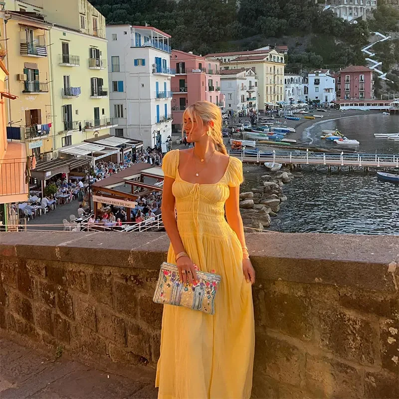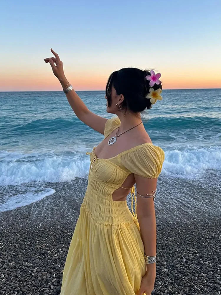 Summer Vacation Elegant Backless Square Neck Long Dress Sexy Lace Up High Waist Slim Dresses Lady Holiday Beachwear