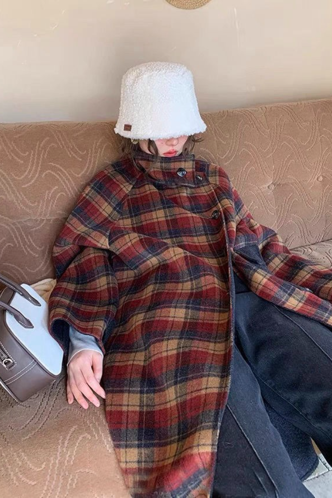Plaid Wool Blend Stand Collar Mid-Length Christmas Outerwear