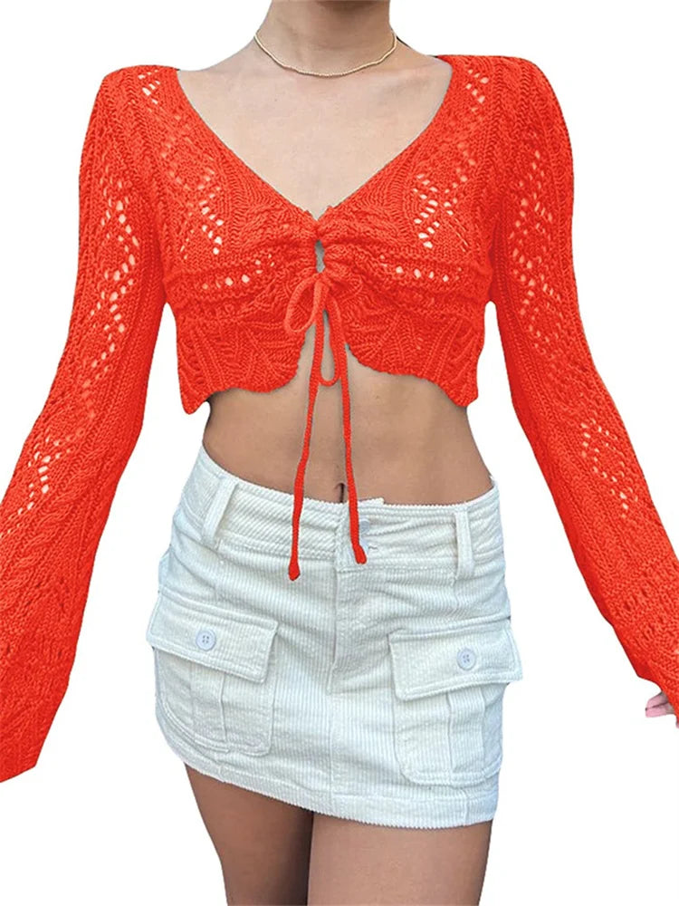 JuliaFashion - Knitted Hollow Out Cardigan Long Flare Sleeve V Neck Front Drawstring Summer Autumn Sweater