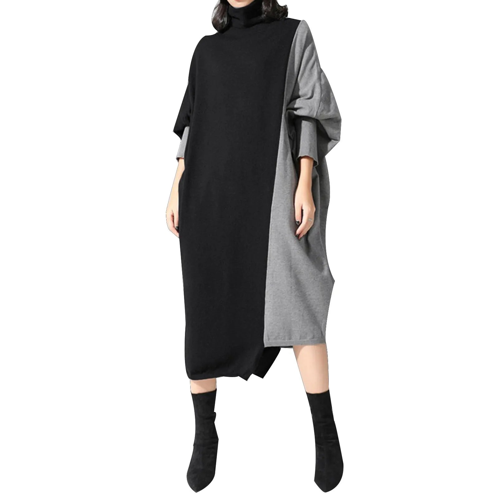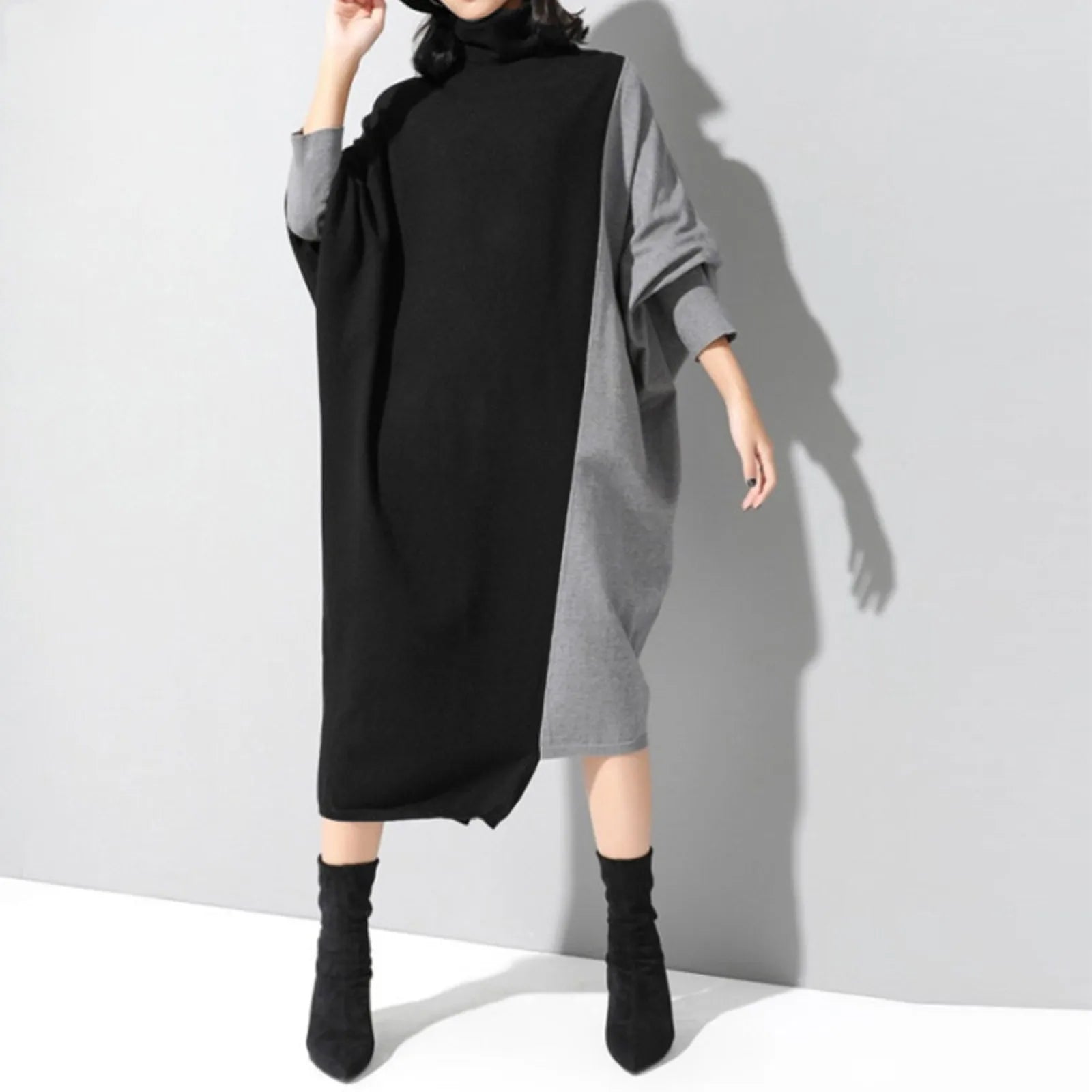 JuliaFashion - Korean Style Spliced Knitted Midi Autumn Fashion Turtleneck Long Sleeve Oversized All-Match Elegant Female Dress