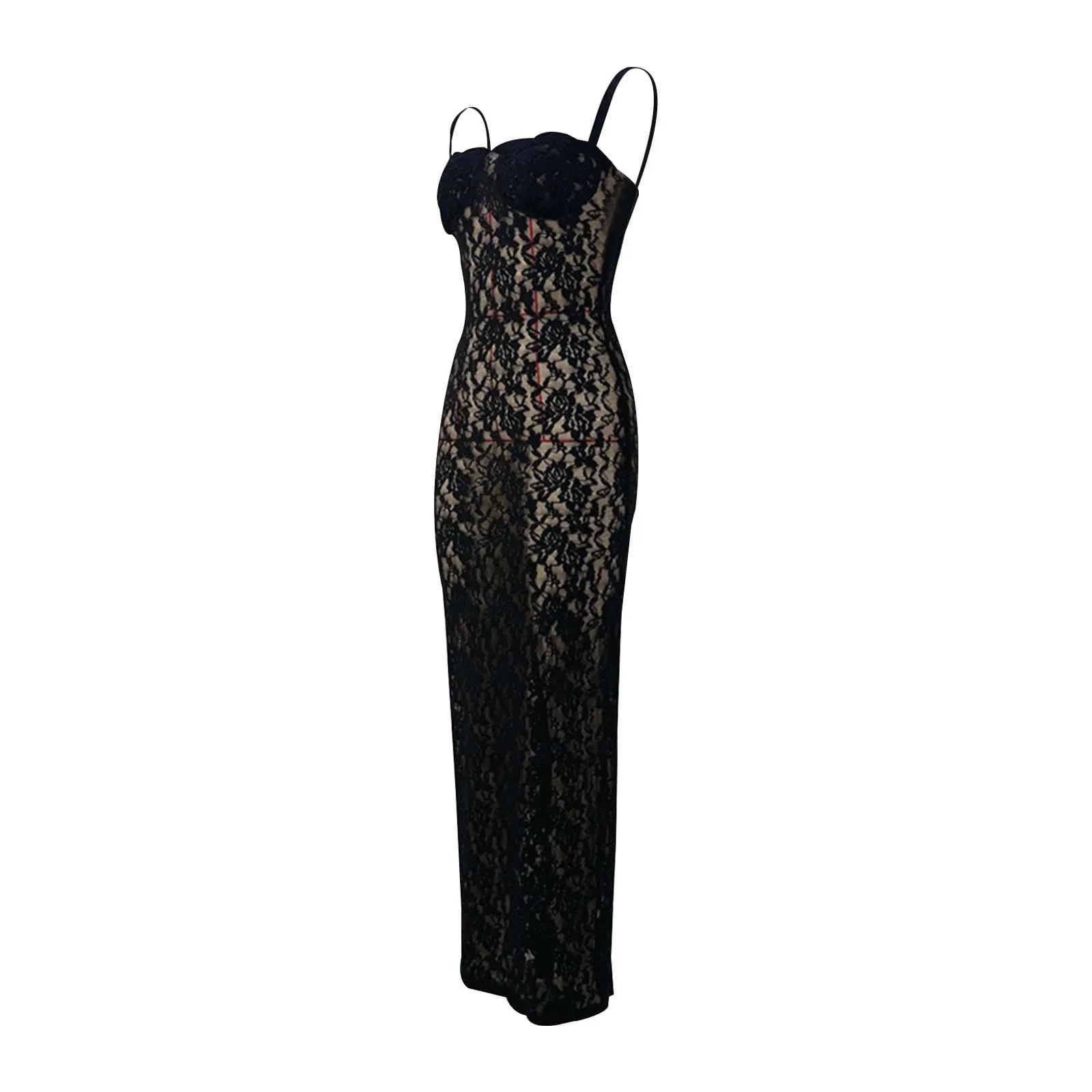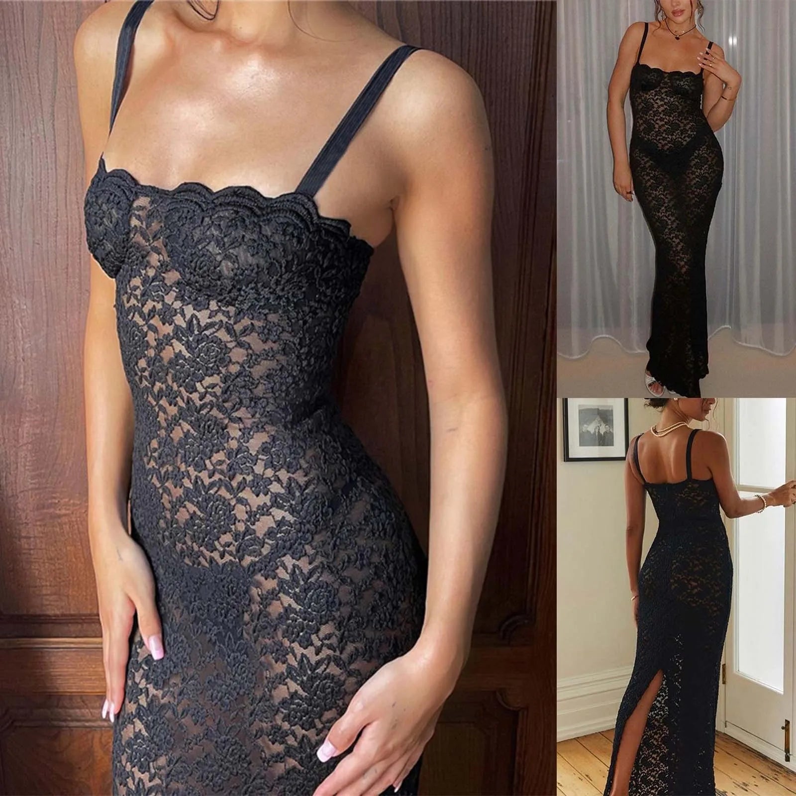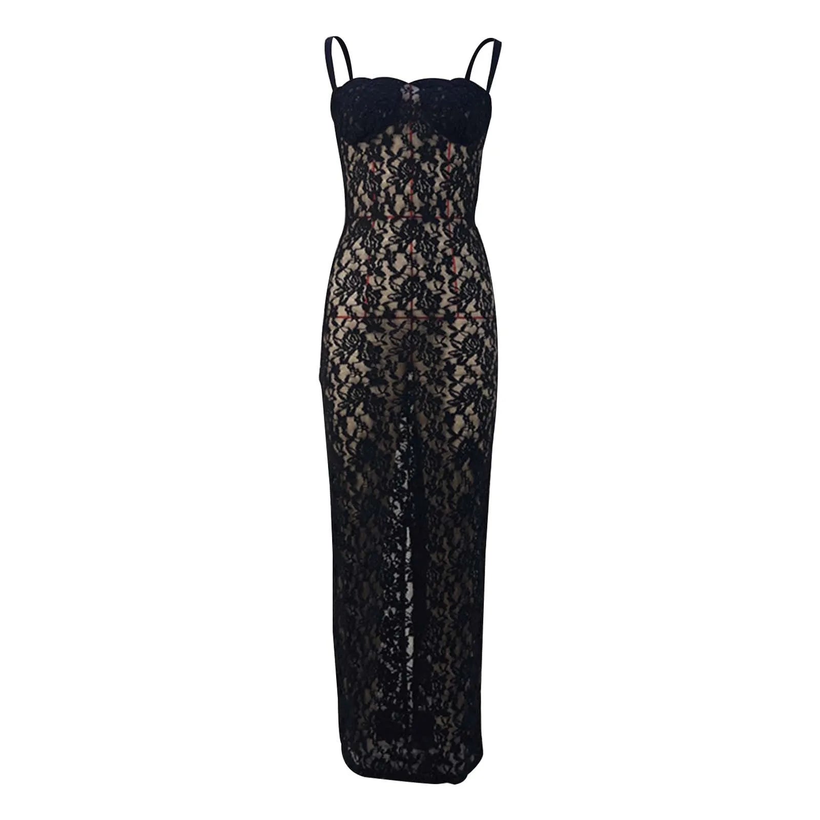JuliaFashion - Ladies Lace Bodycon Fashion Solid Sexy See Through Lace Splicing Sleeveless Backless Bag Hip Elegant Women Party Dress