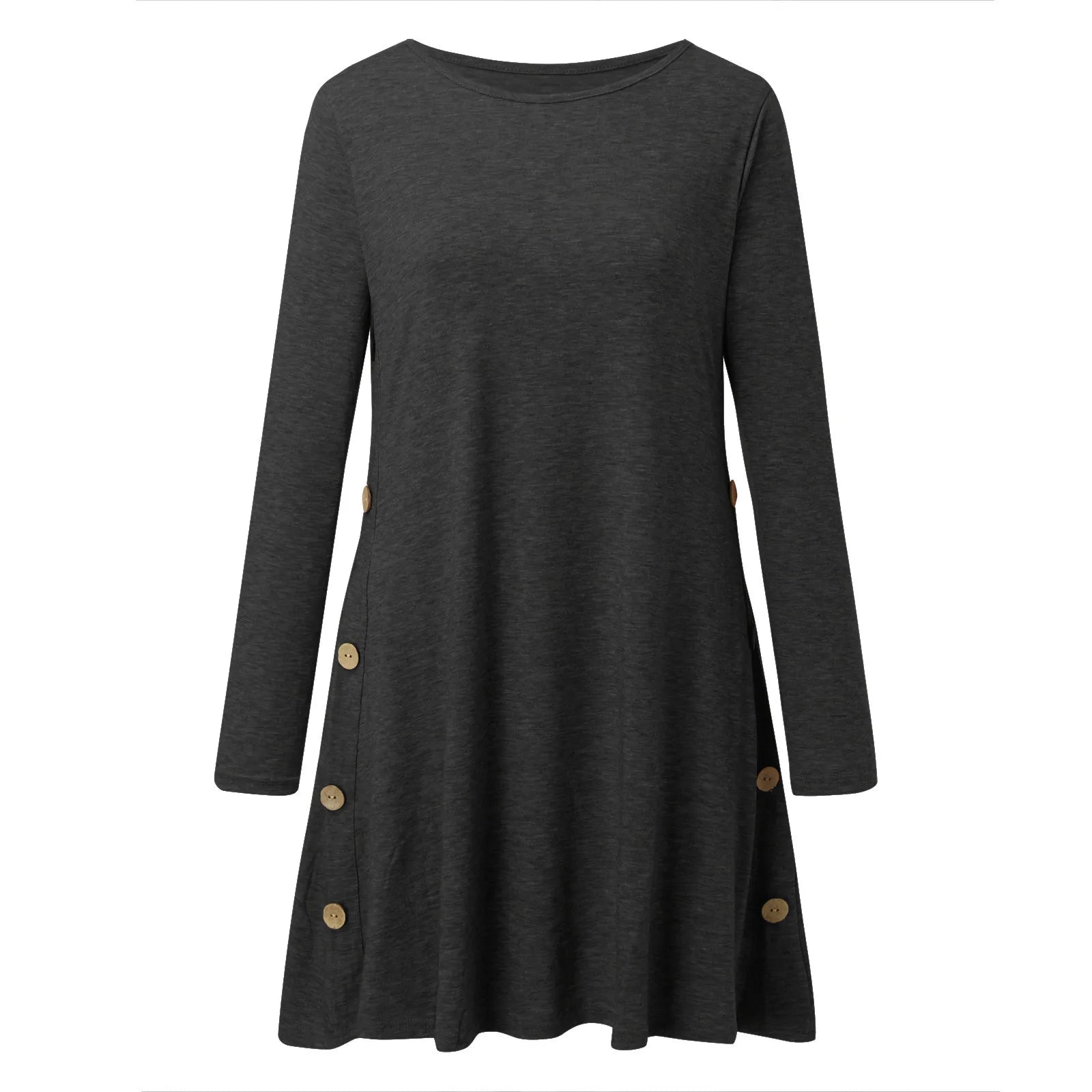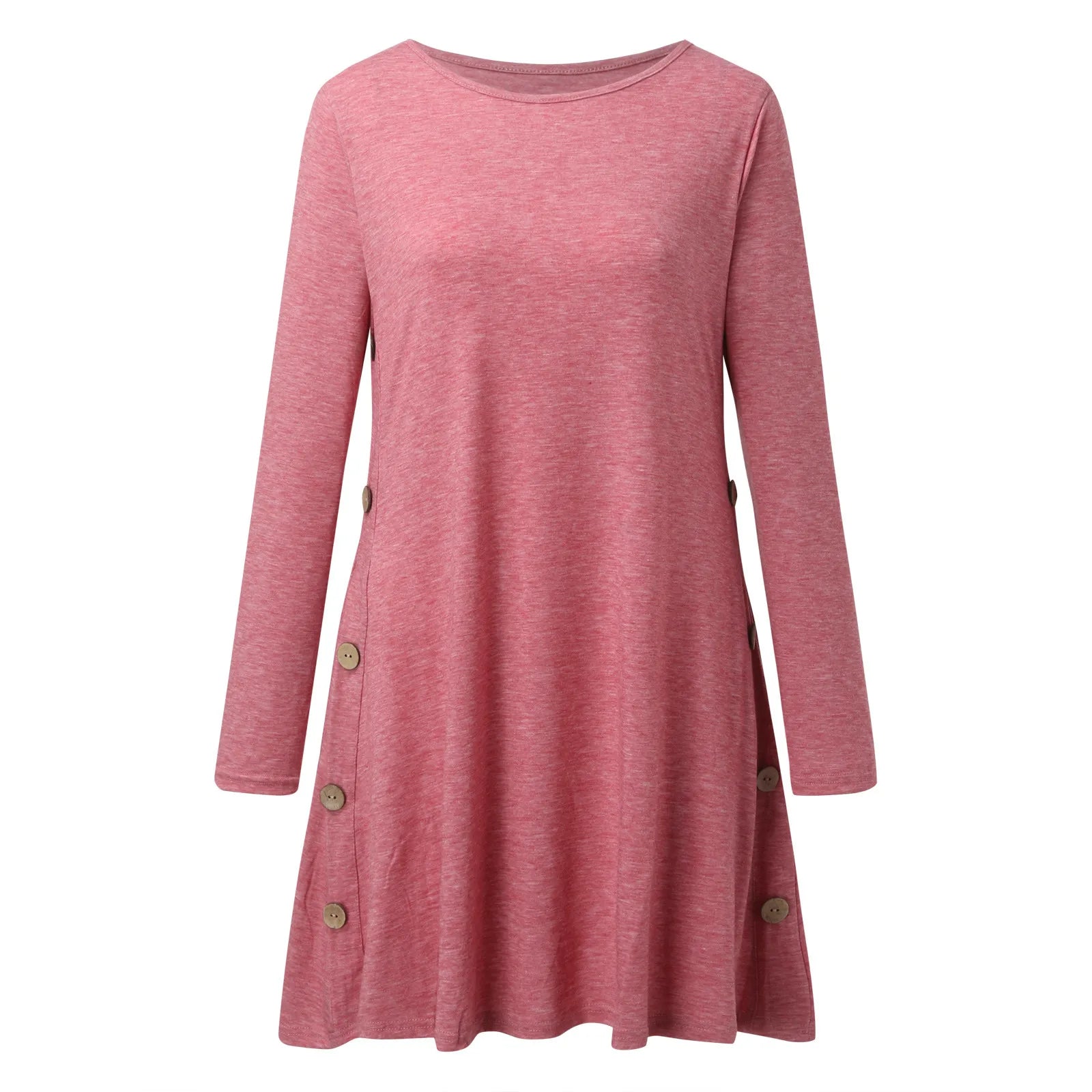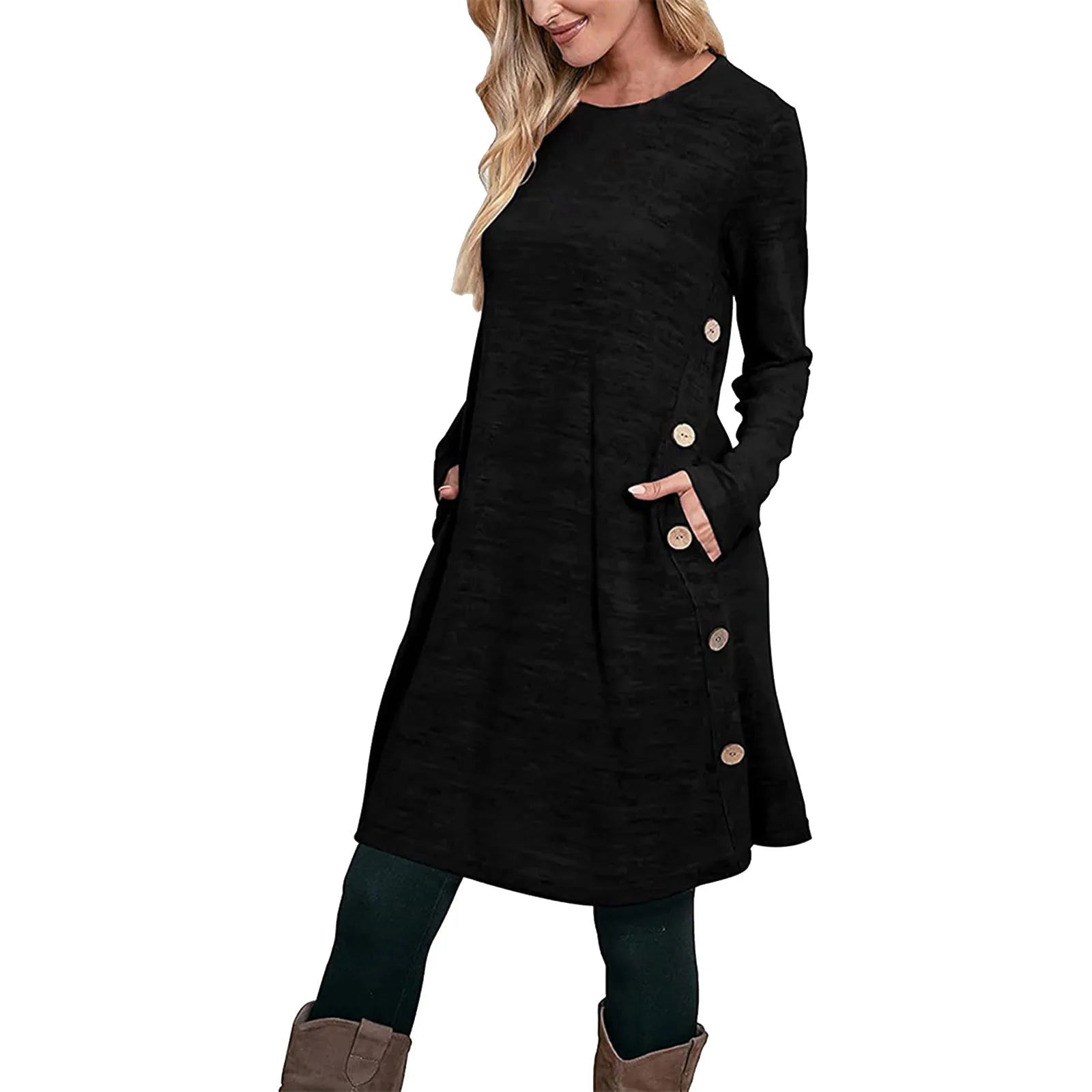 JuliaFashion - Ladies Round Neck Long Sleeve Solid Color Cotton Knit Buckle Pocket A Line Fashion SunFor Women Autumn 2024 Dress