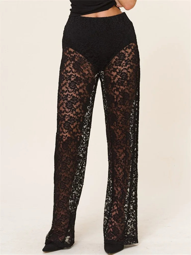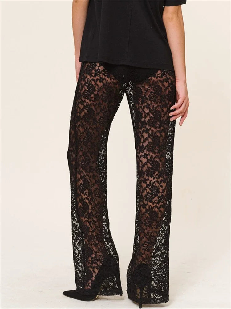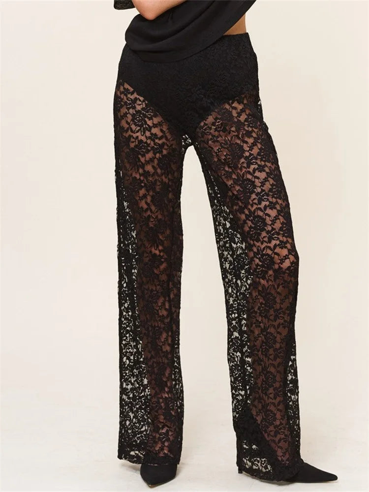 JuliaFashion - Mesh See Through Lace Gothic High Waist Wide Leg Flare Pants