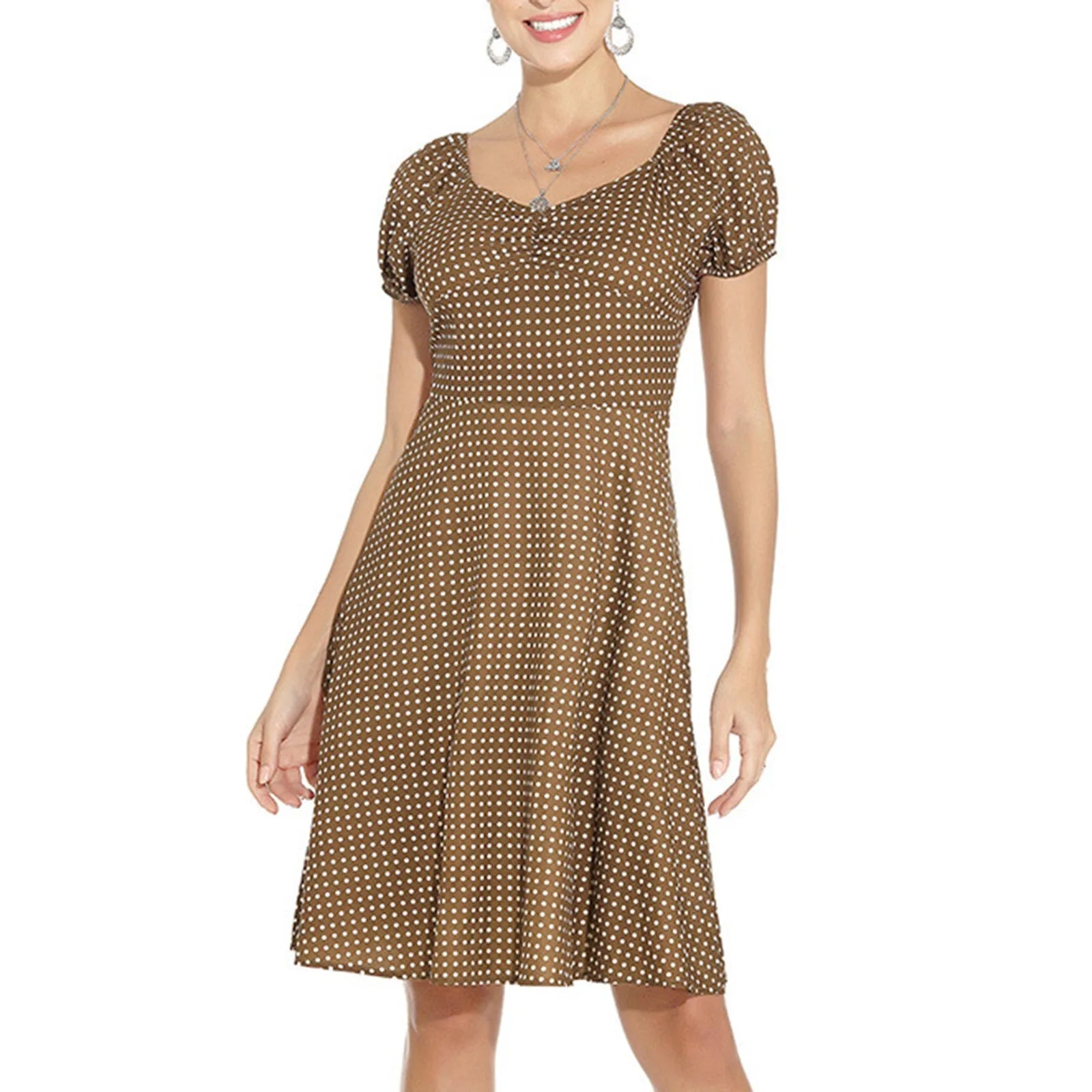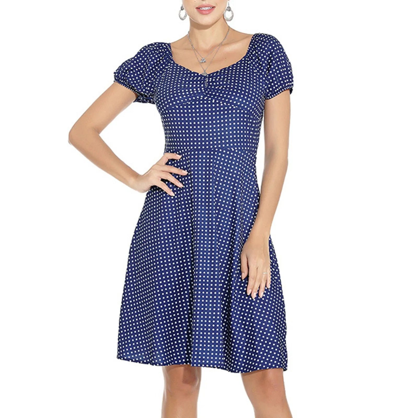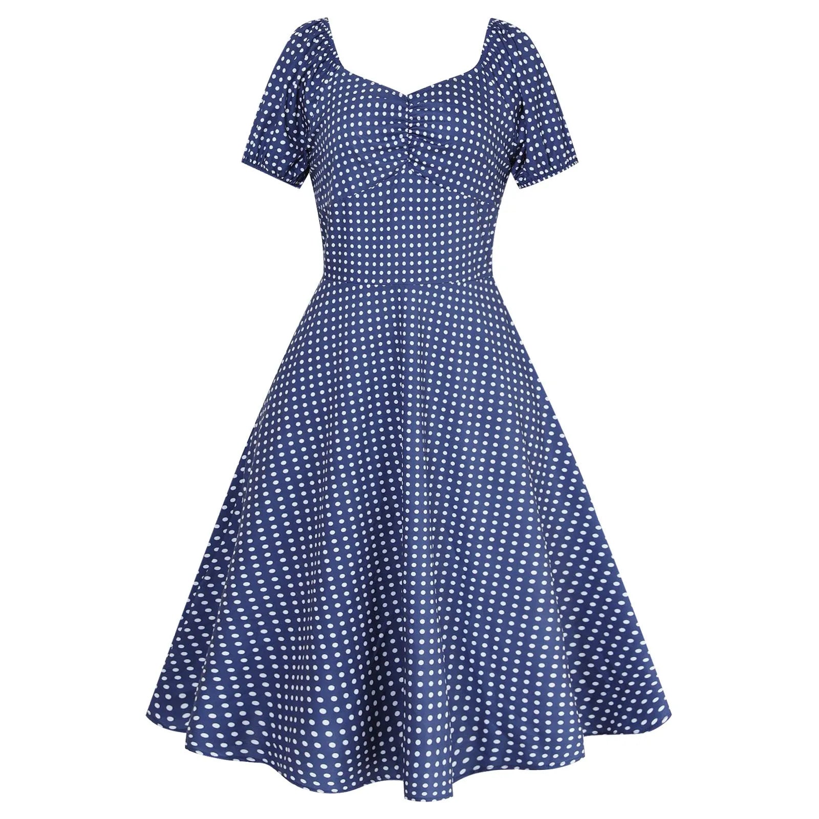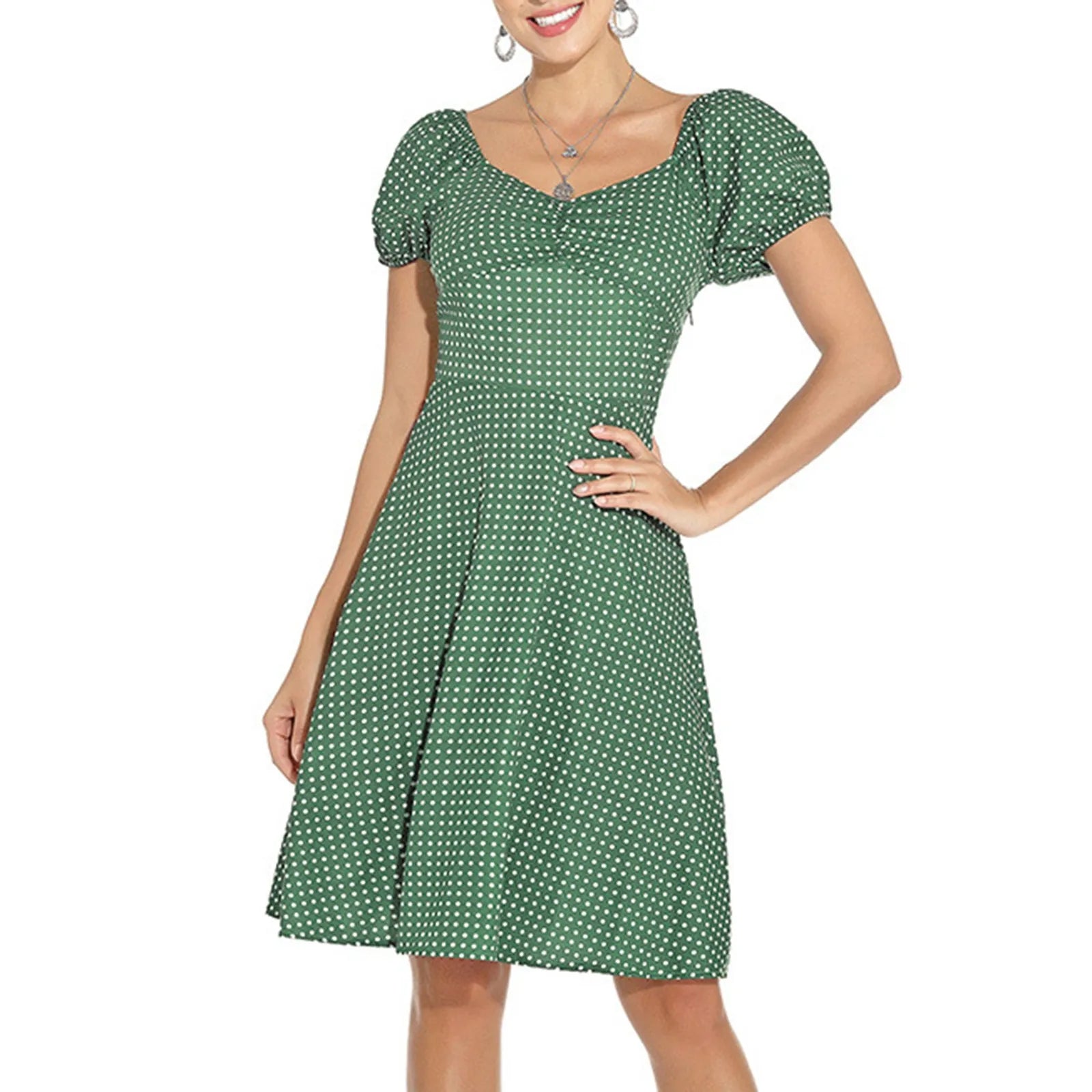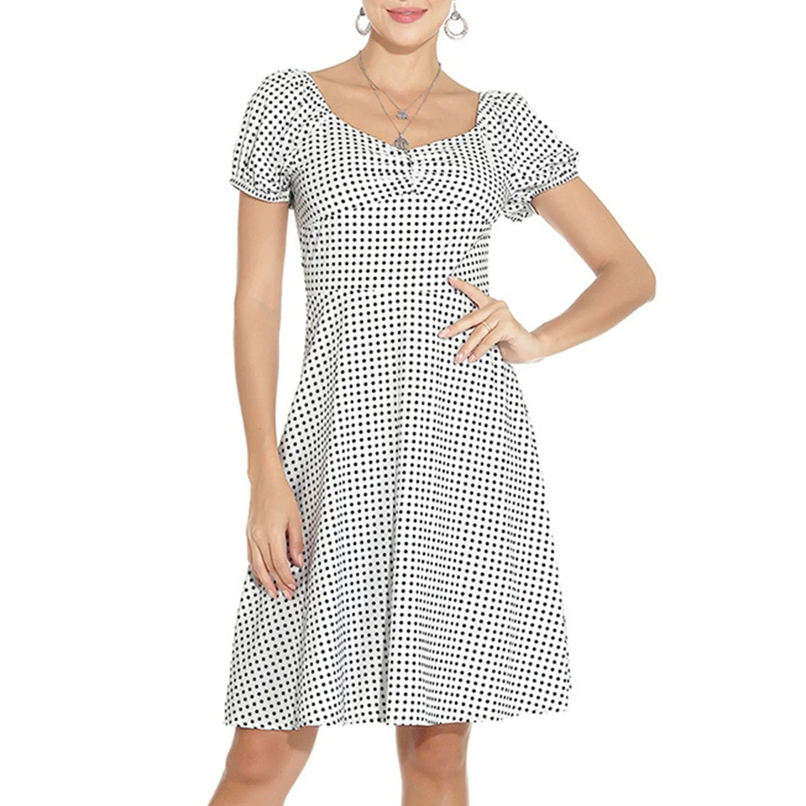 JuliaFashion - New Square Neck Puff Short Sleeve Elastic Shirred Slim Swing Midi French Style Polka Dot A Line Dress