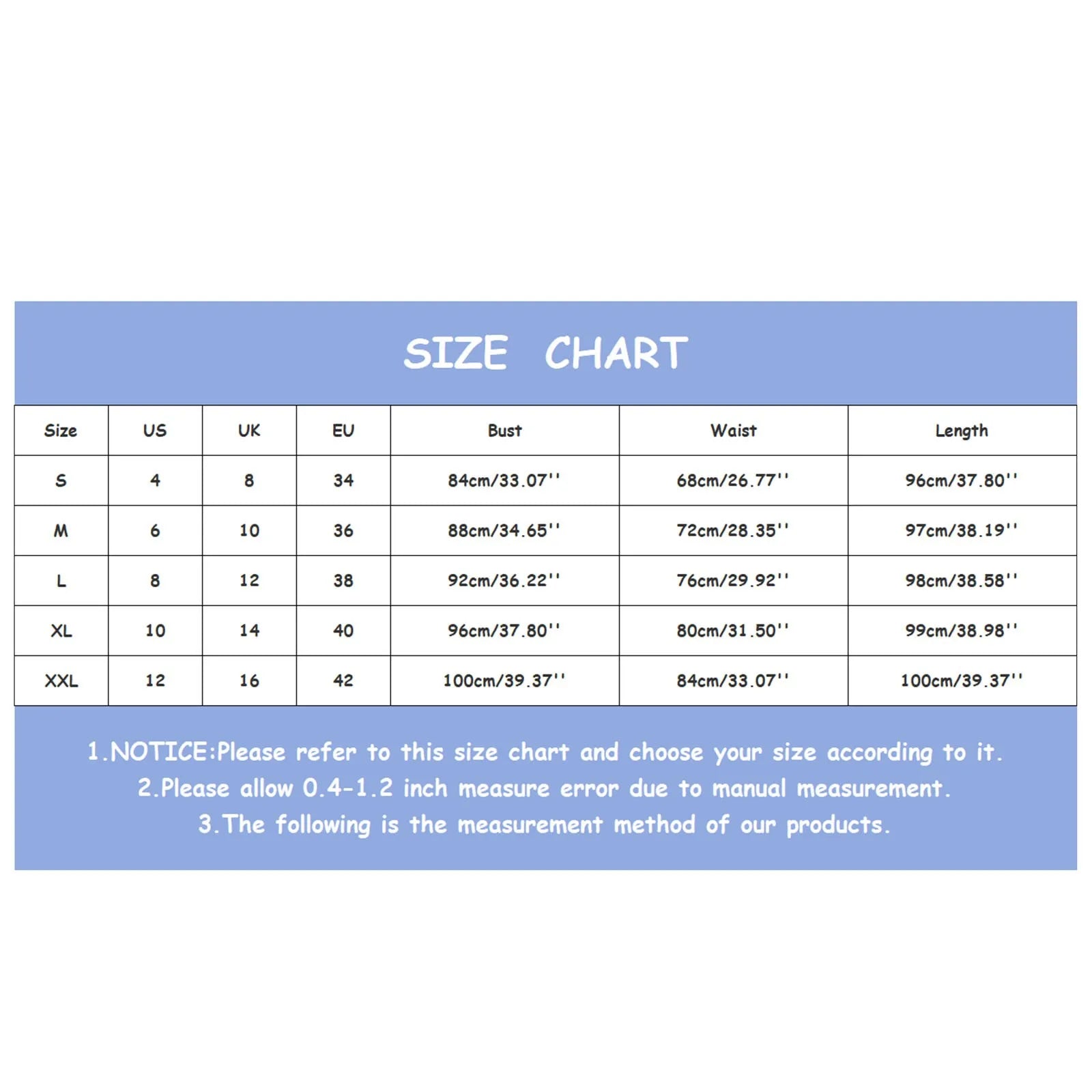| Size | US | UK | EU | bust | Waist | Length |