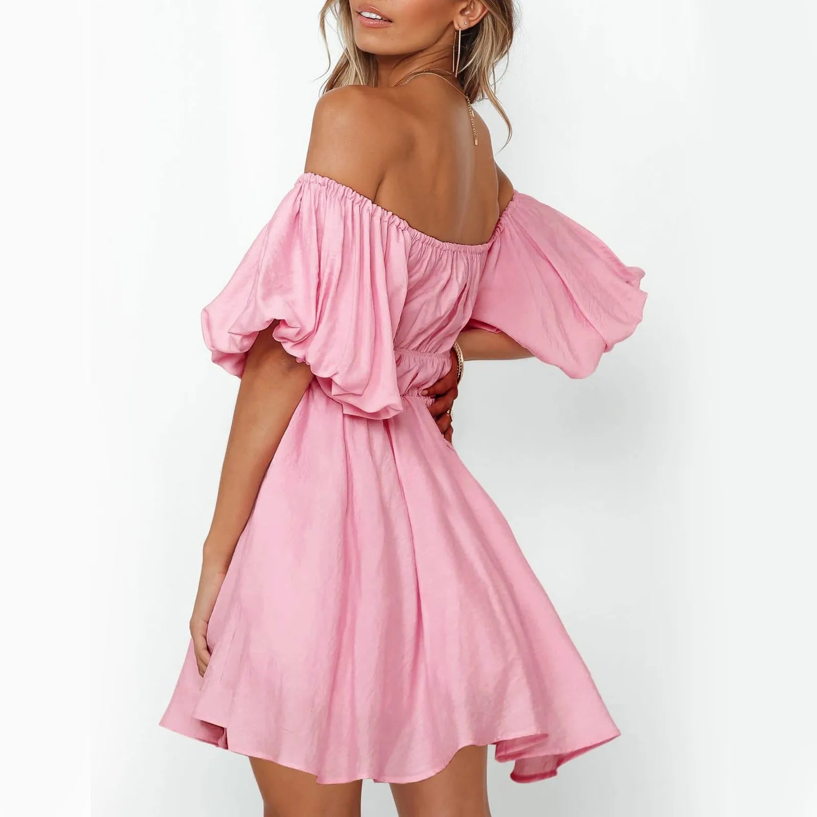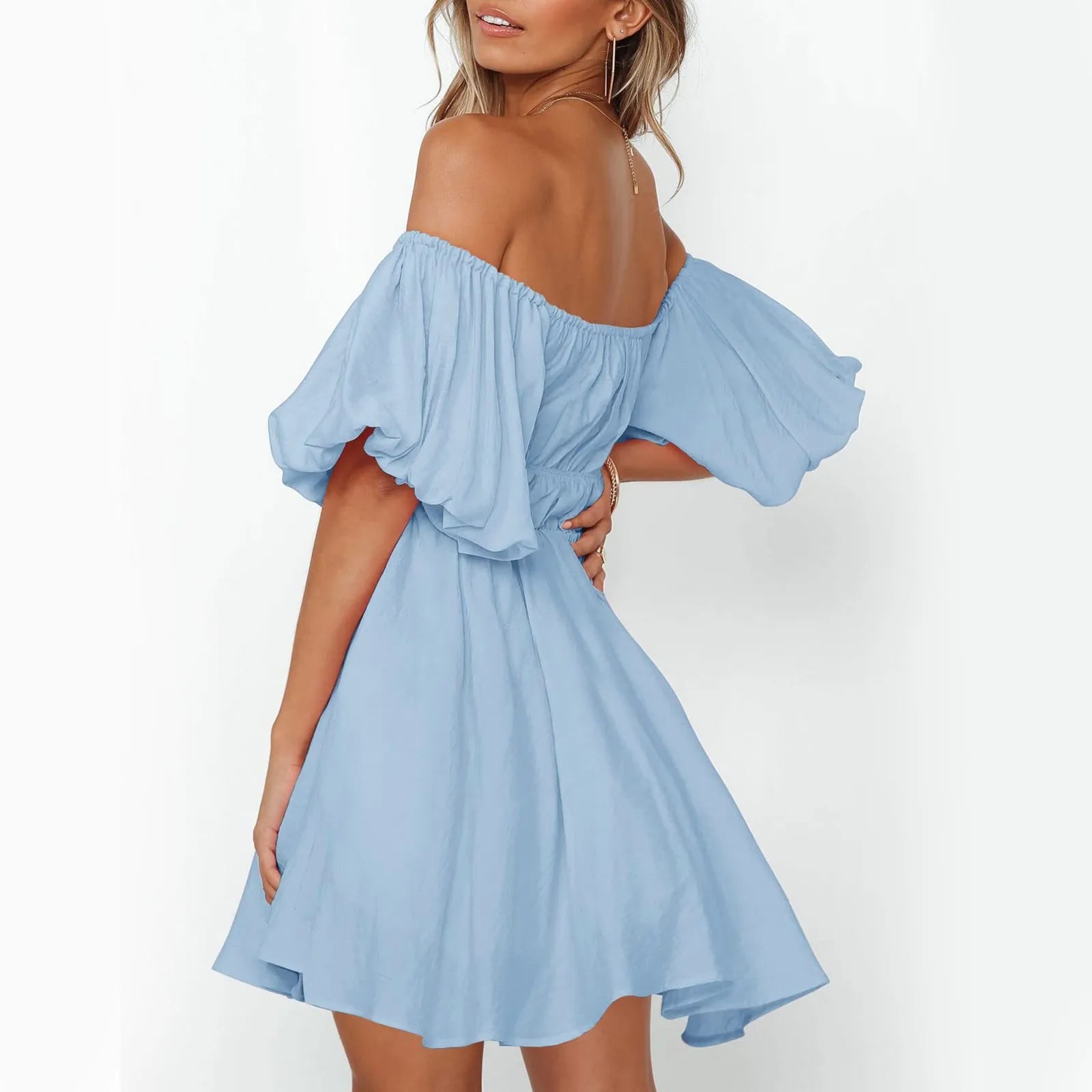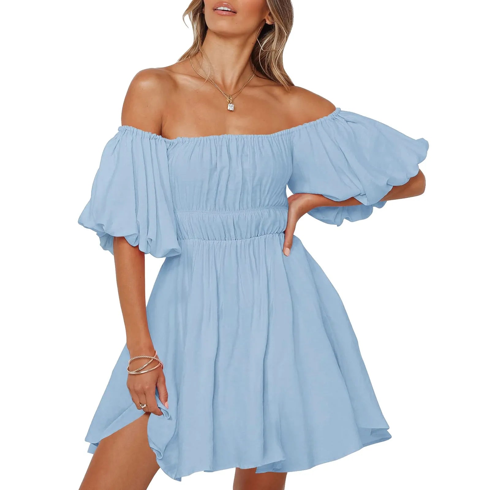 JuliaFashion - Off Shoulder Flared Mini 2024 Fashion Ruffled Short Sleeve White Flowy Swing Casual Party Vacation Vestidos Dress