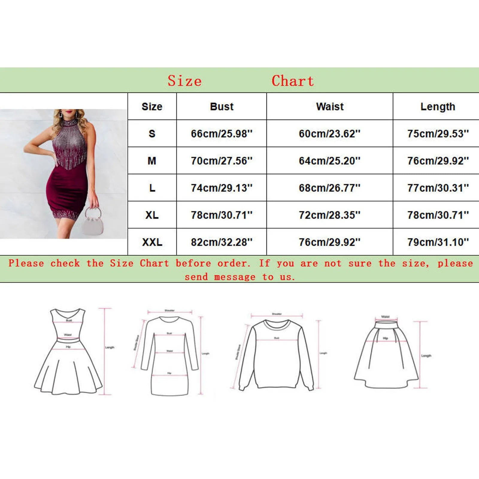 | Size | US | UK | EU | Bust | Waist | Length |