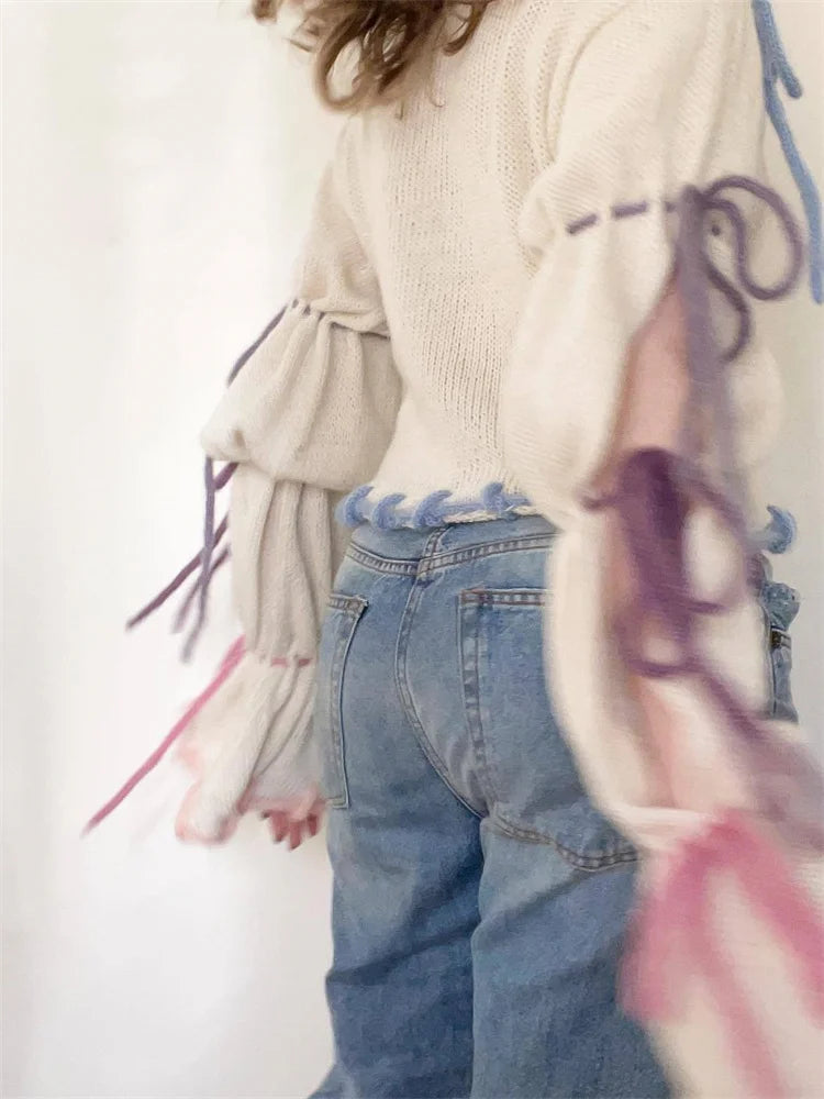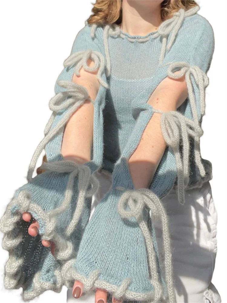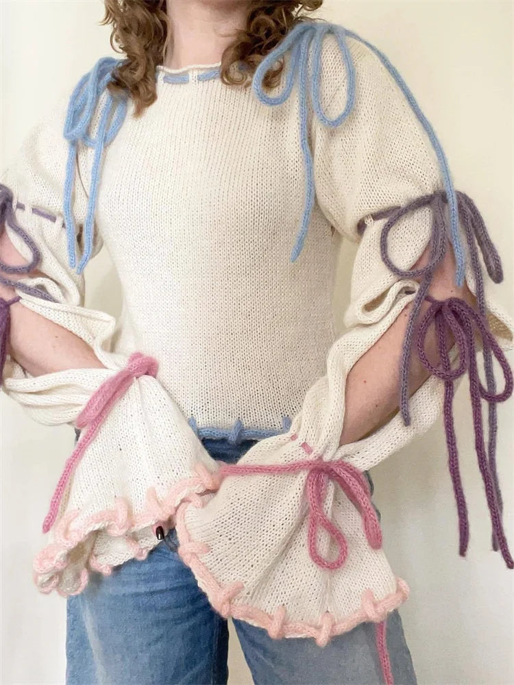 JuliaFashion - Slim Fit Knitted Patchwork Tie-Up Cutout Long Flare Sleeve Pullovers Spring Autumn Sweater