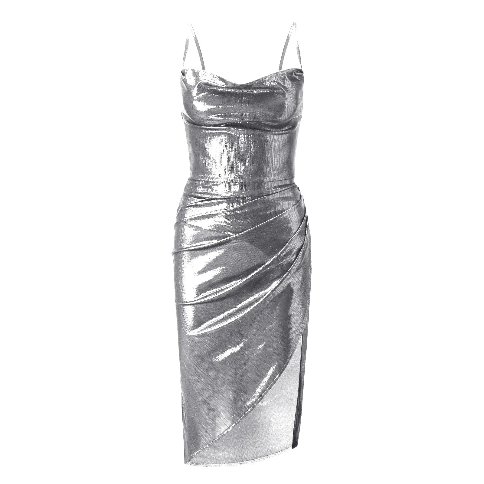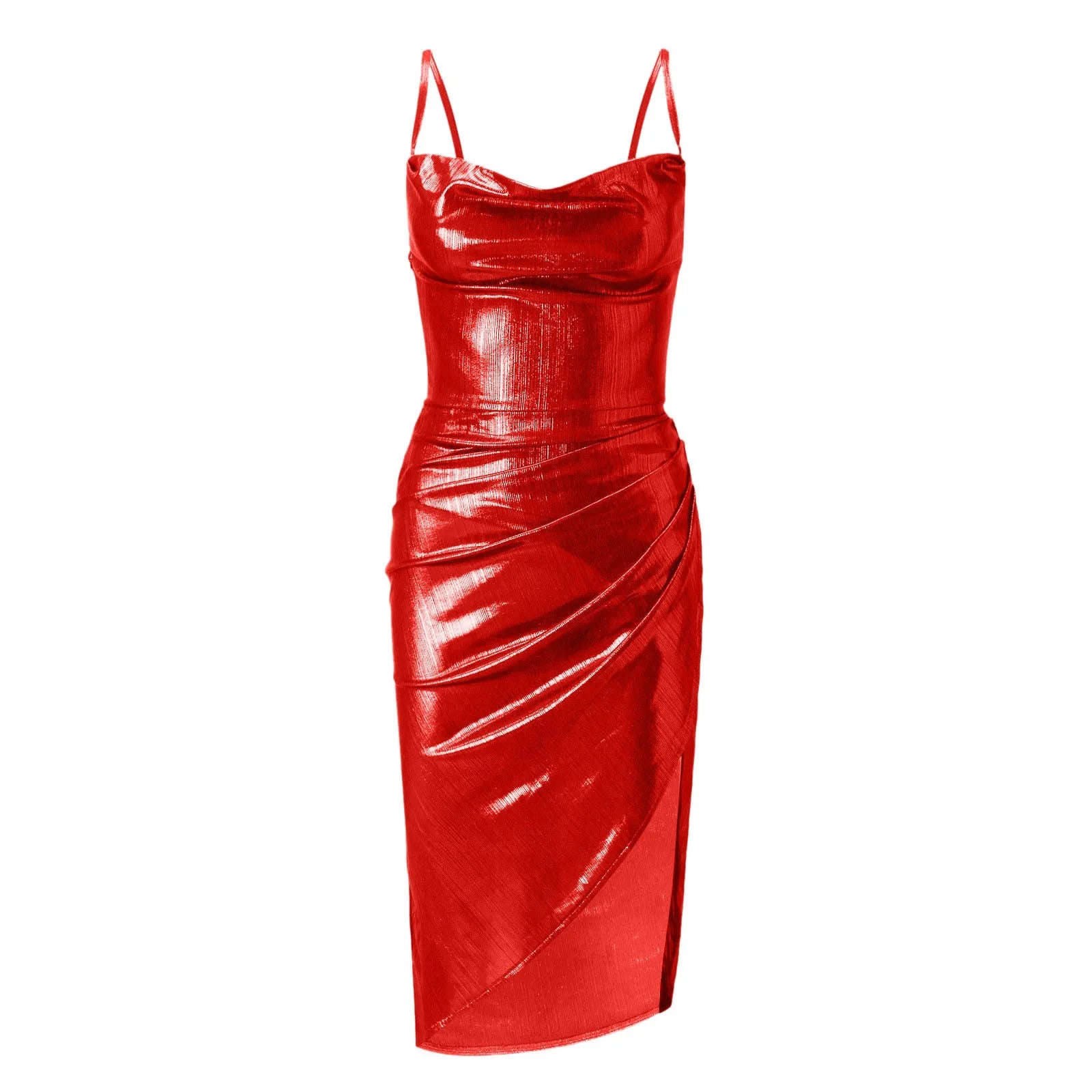 JuliaFashion - Spaghetti Strap Sexy Party Women Sleeveless Stretch Ruched Split Midi Robes High Waist Cocktail Elegant Chic Dresses 2024