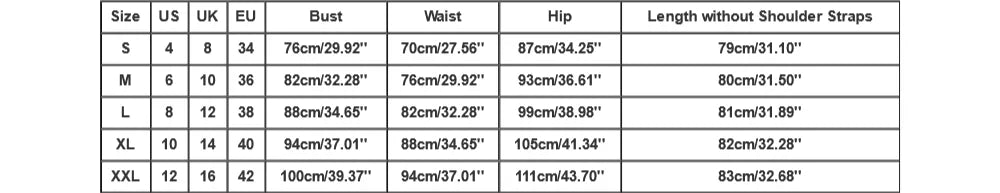 | Size | US | UK | EU | Bust | Waist | Hip | Length without Shoulder Straps |
