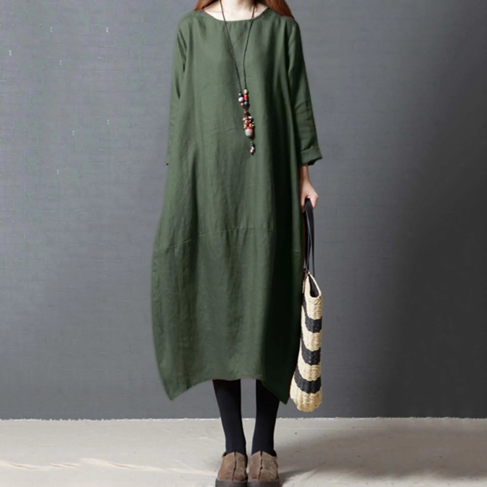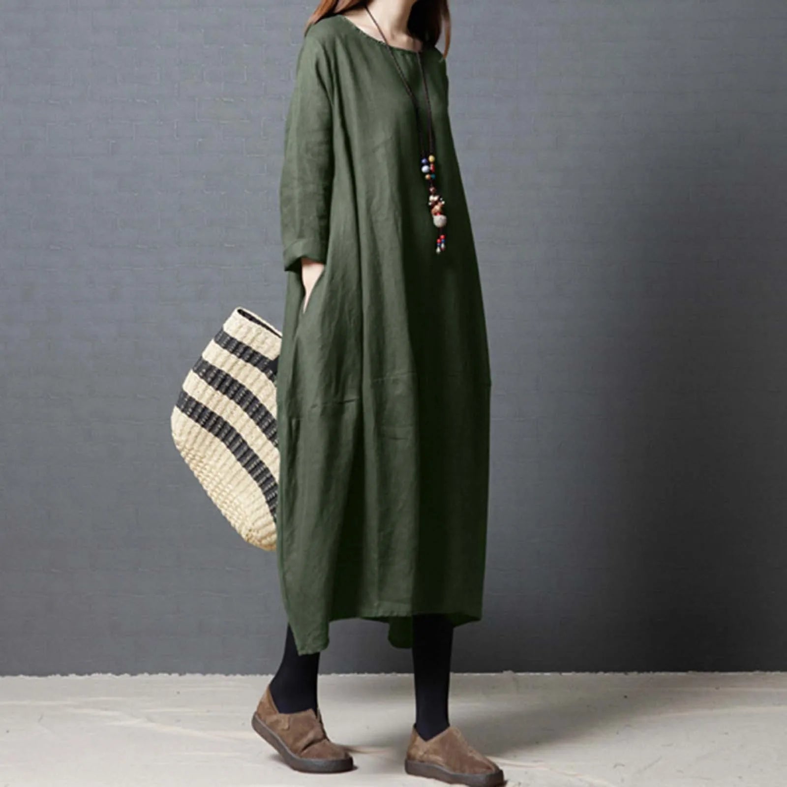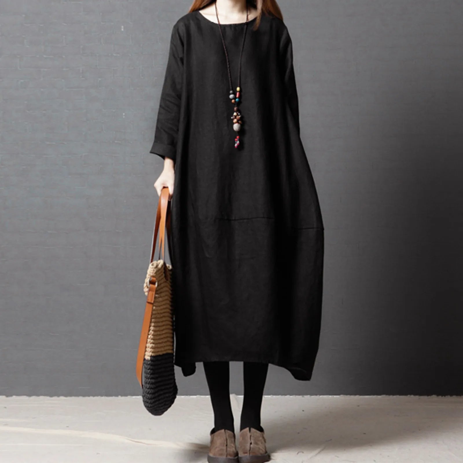 JuliaFashion - Women Long 3/4 Long Sleeve Round Neck Cotton And Linen Loose Women'S Casual Solid Color For Women 2024 Dress