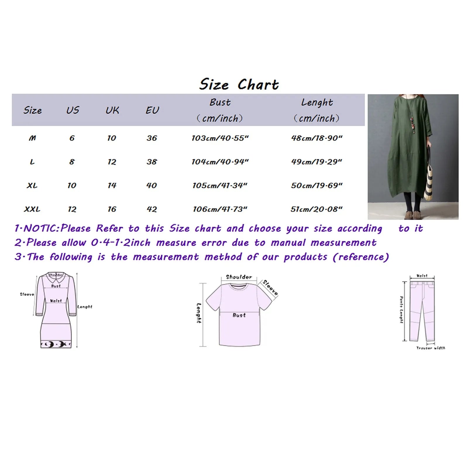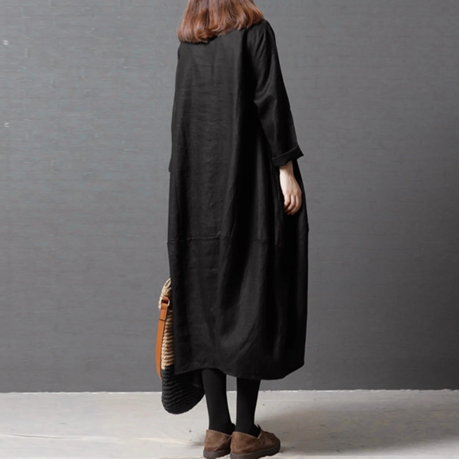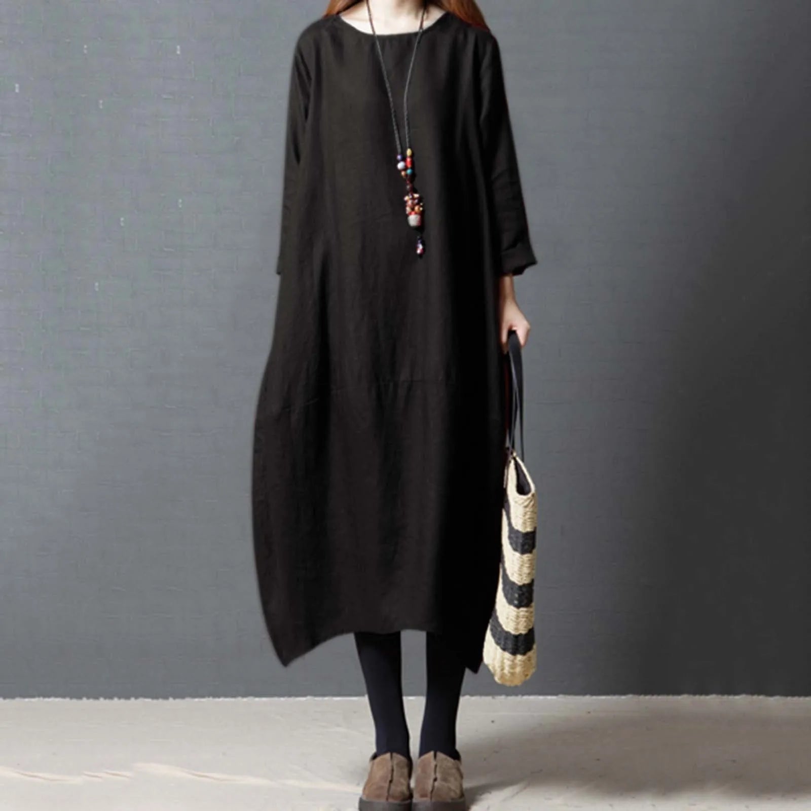 JuliaFashion - Women Long 3/4 Long Sleeve Round Neck Cotton And Linen Loose Women'S Casual Solid Color For Women 2024 Dress