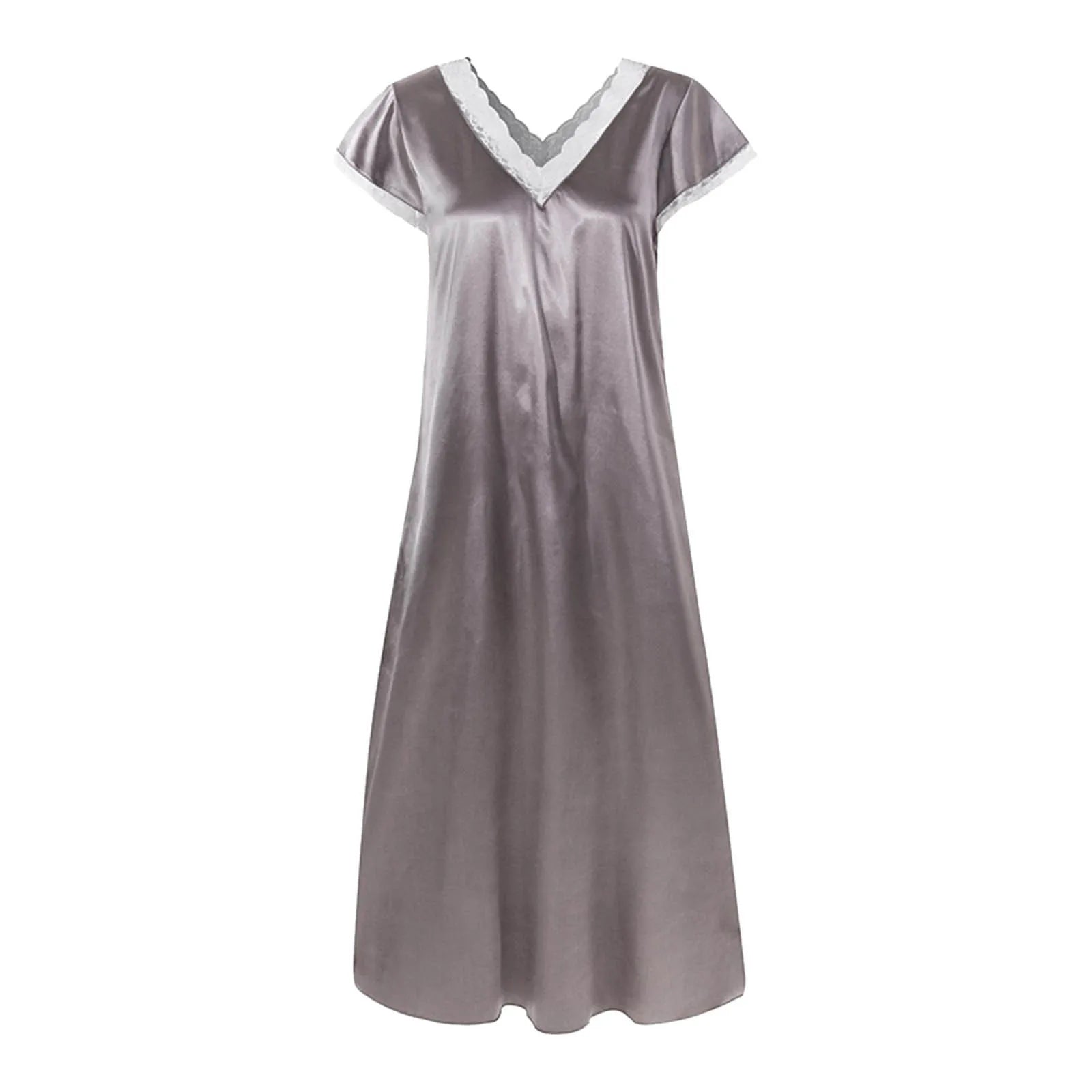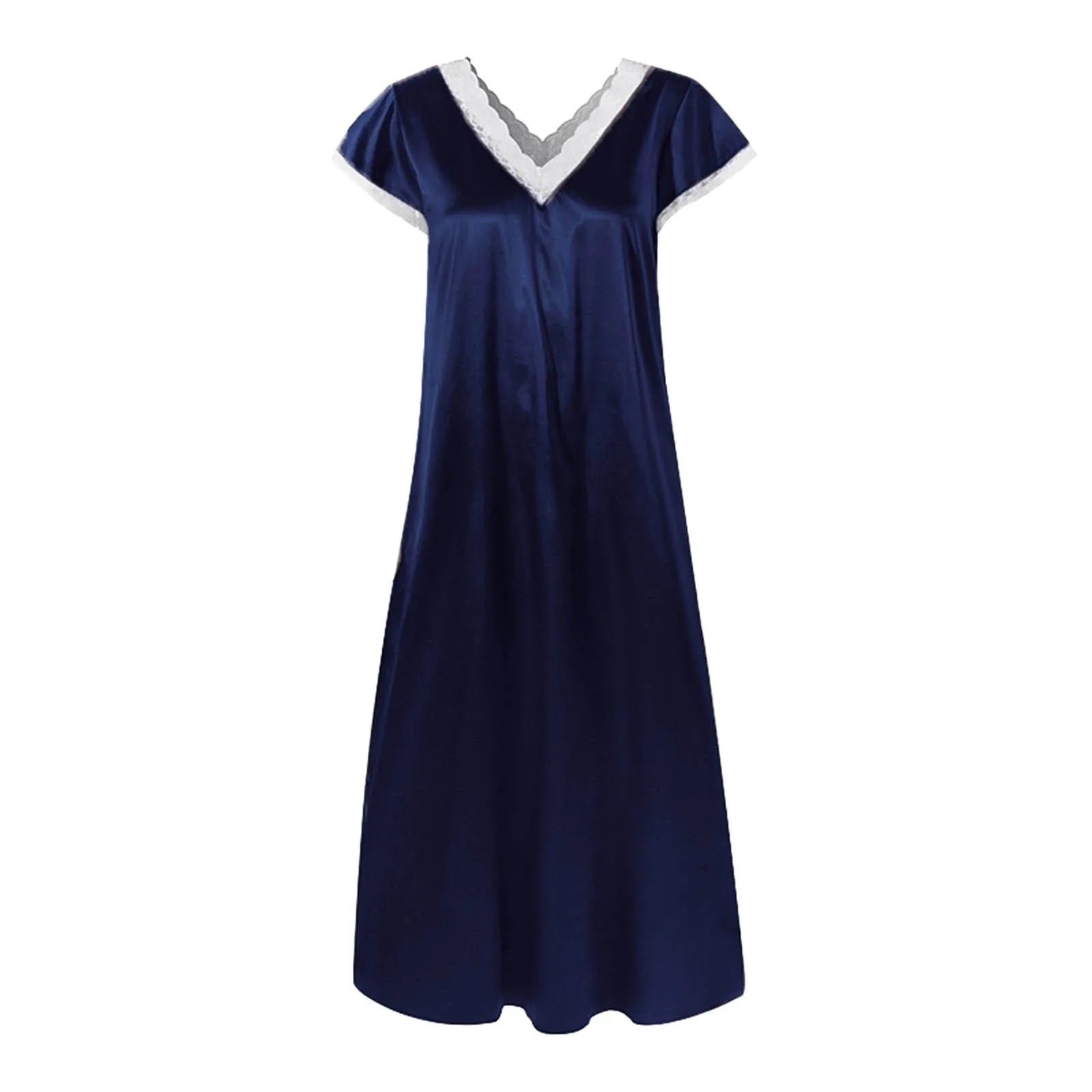 JuliaFashion - Women Pijamas 2024 Sexy Nightgown Long Satin Sleepwear Short Sleeve Lace V Neck Homewear Pajamas Nightwear Robe Femme Dress