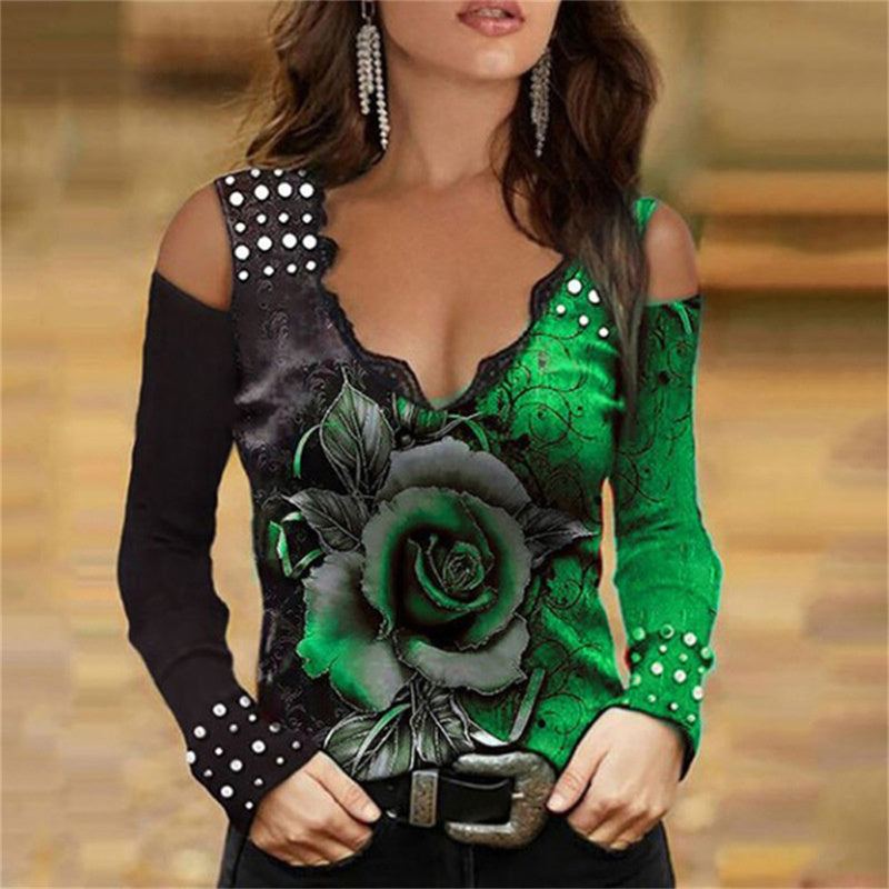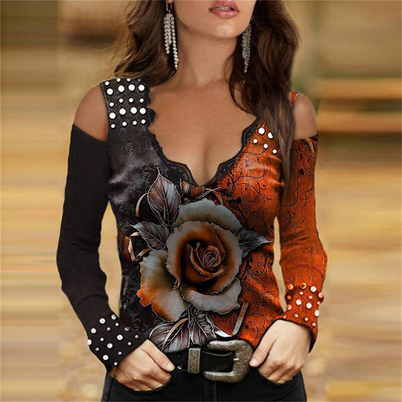 JuliaFashion - 2024 Women Sexy V-Neck Off Shoulder Shirts Tops Rose Printed Clothing