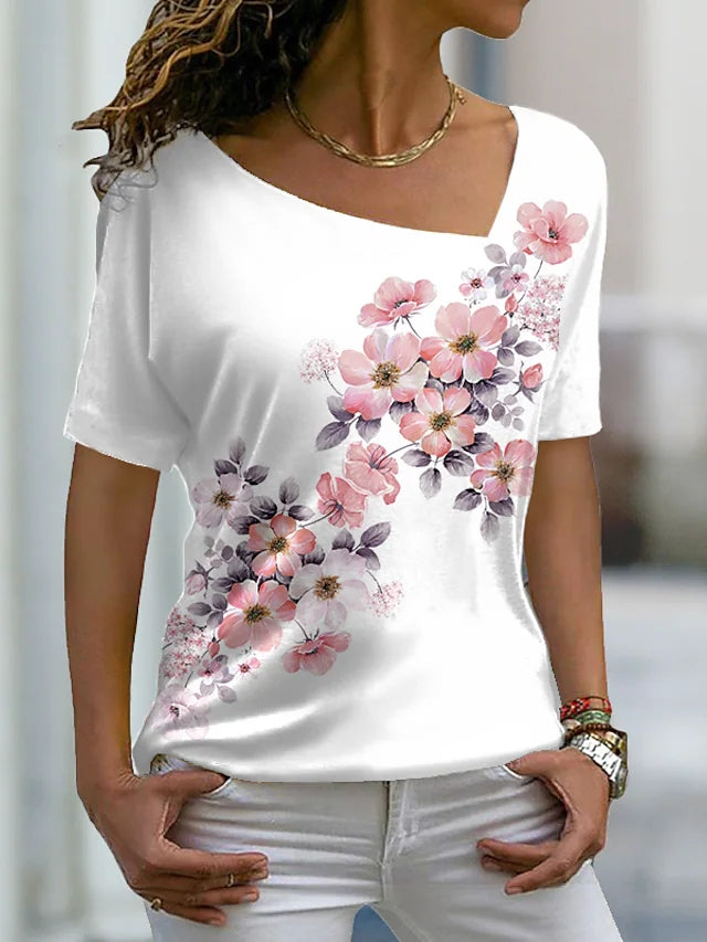 JuliaFashion - 2024 Women Floral Painting Short Sleeve Print V-Neck Tops