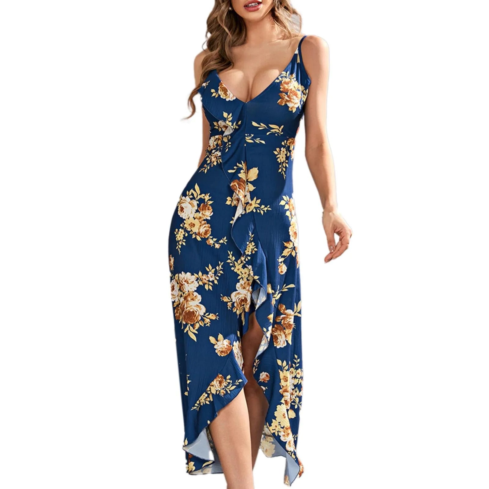 JuliaFashion - Women Summer V-Neck Mid-Calf Casual Printed High Waist Ruffles Sleeveless Sexy Slip All-Match Women's Clothing Dress