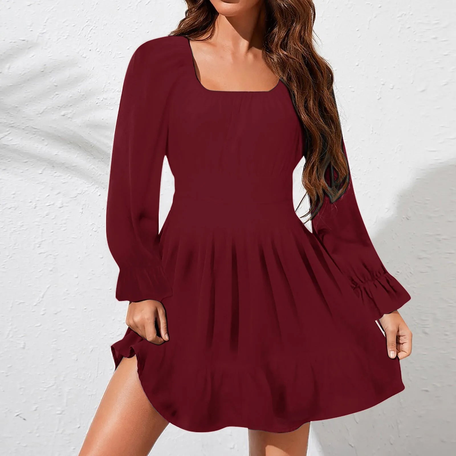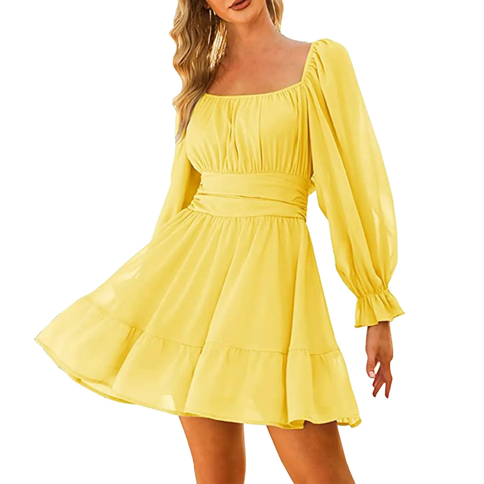 JuliaFashion - Women'S Long Sleeve Square Neck Frilled Slim Mid Length Chiffon Backless Solid Color Ruffles Summer Swing For Women Dress