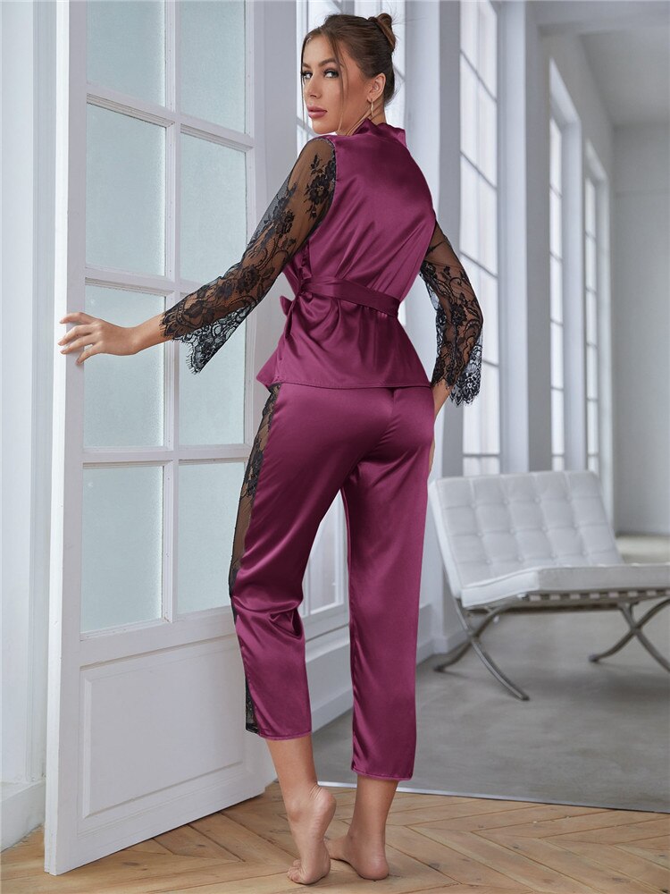 JuliaFashion-Hollow Out Lace Long Sleeve with Pant Loungewear